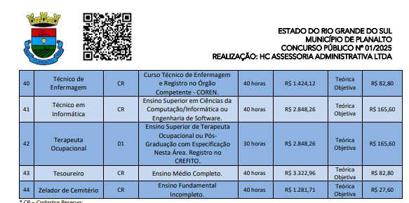 O texto completo do edital também estará disponível no site da empresa organizadora, hcassessoriaadm.com.br, no portal oficial da Prefeitura (www.planalto.rs.gov.br), no Mural de Publicações Oficiais do Município, e no Diário Oficial dos Municípios do Rio Grande do Sul. Ainda será publicado o Edital Nº 2, com a lista de cargos para a área da educação.